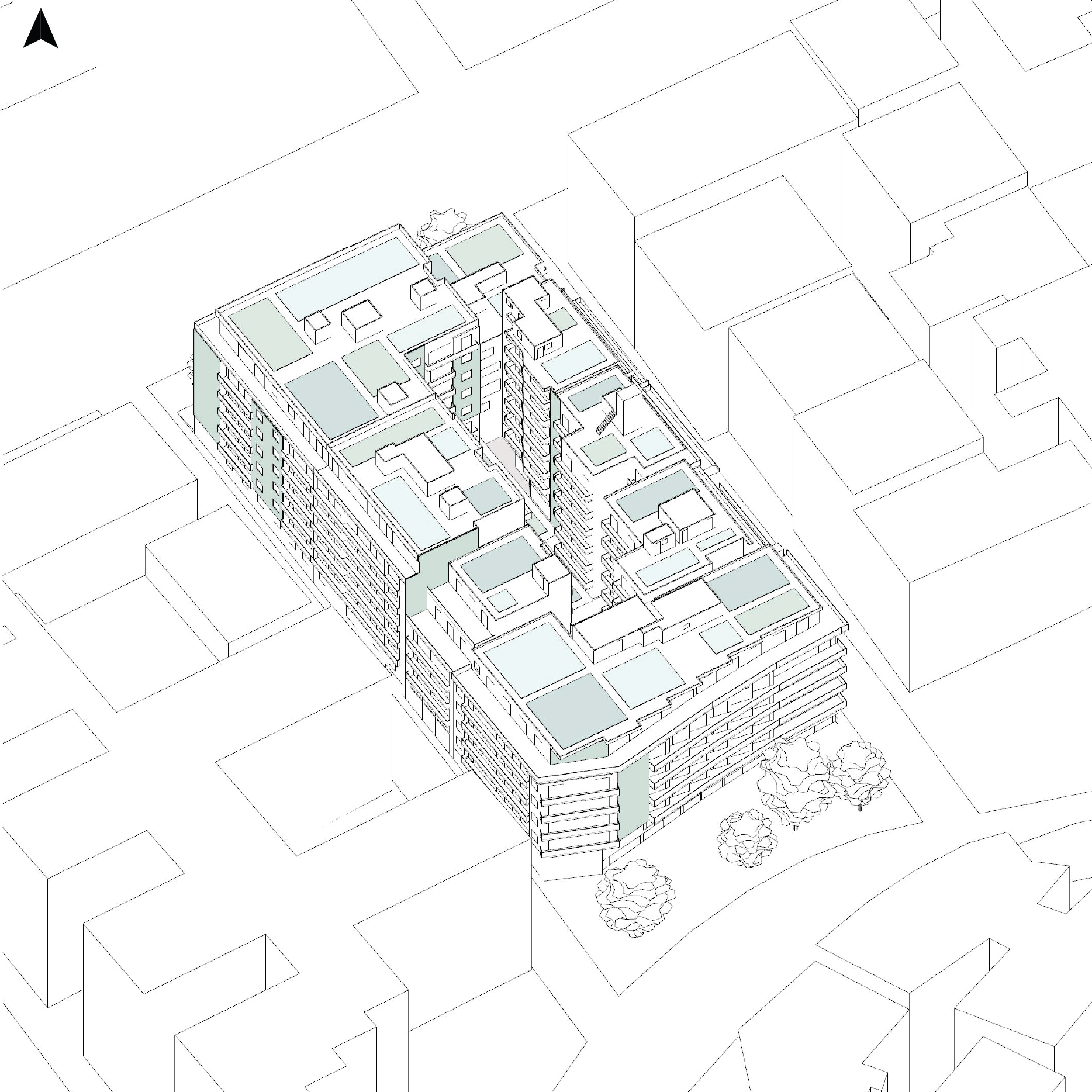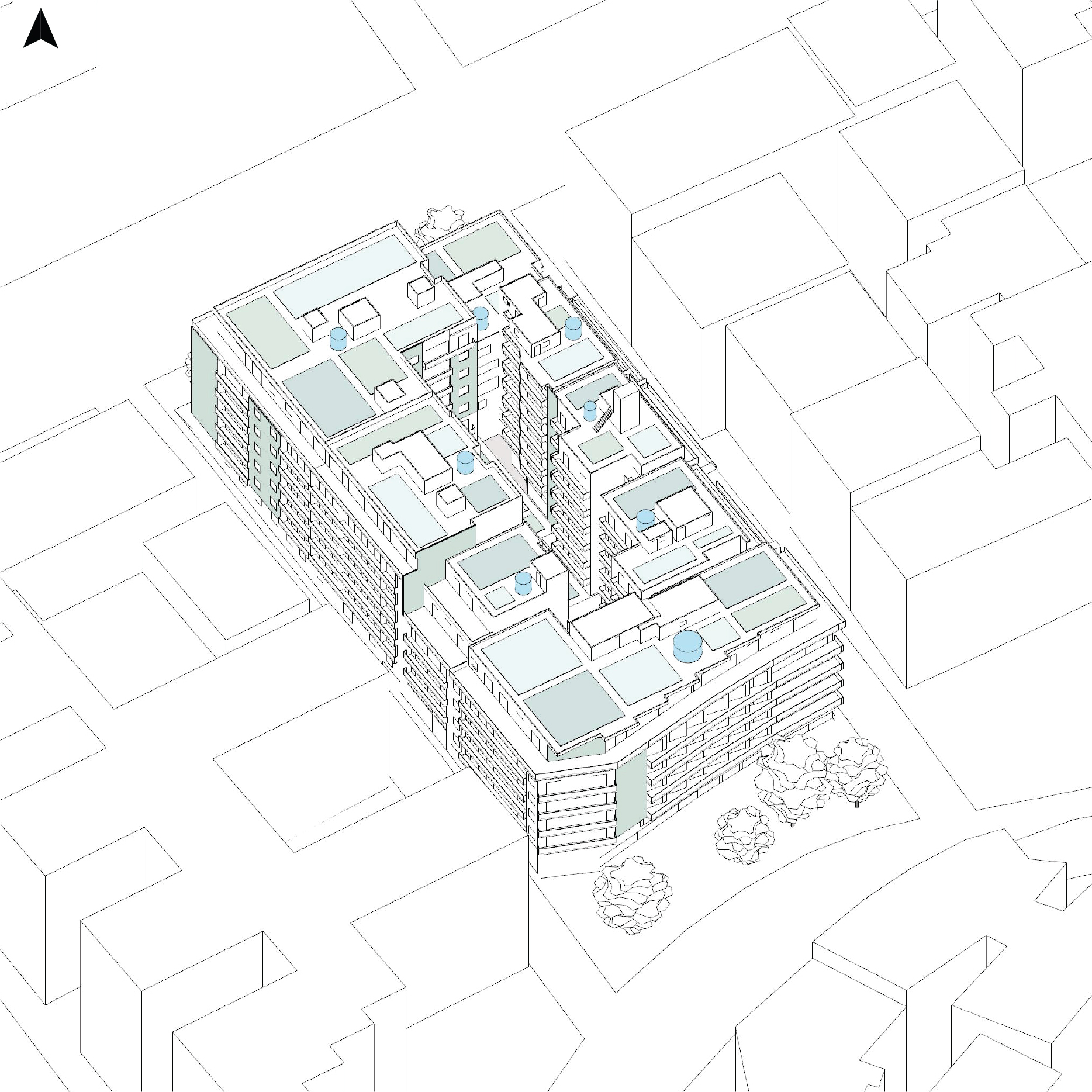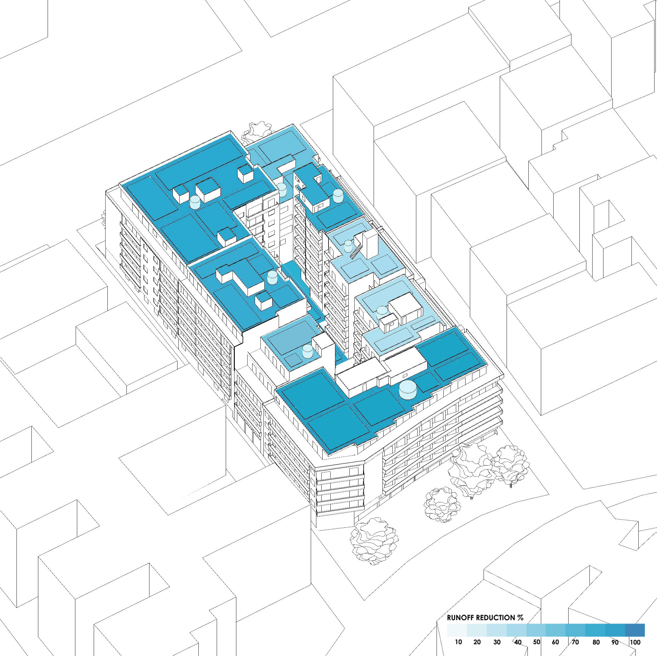 • Scenario 1 (no cisterns): 15-30% runoff reduction on rooftops; 77% in inner block void
