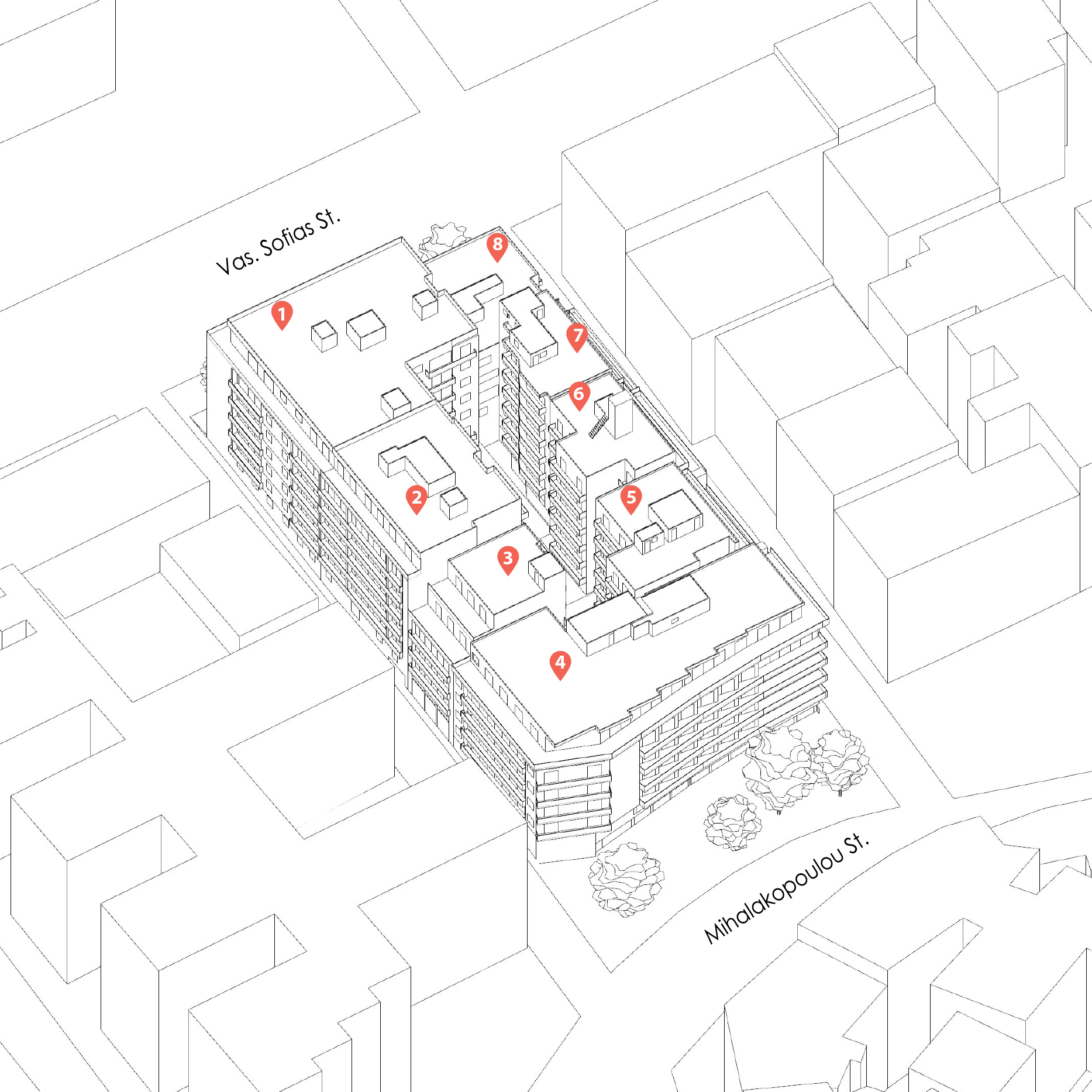 Typical Greek urban block with flat-roofed buildings and an inner block void