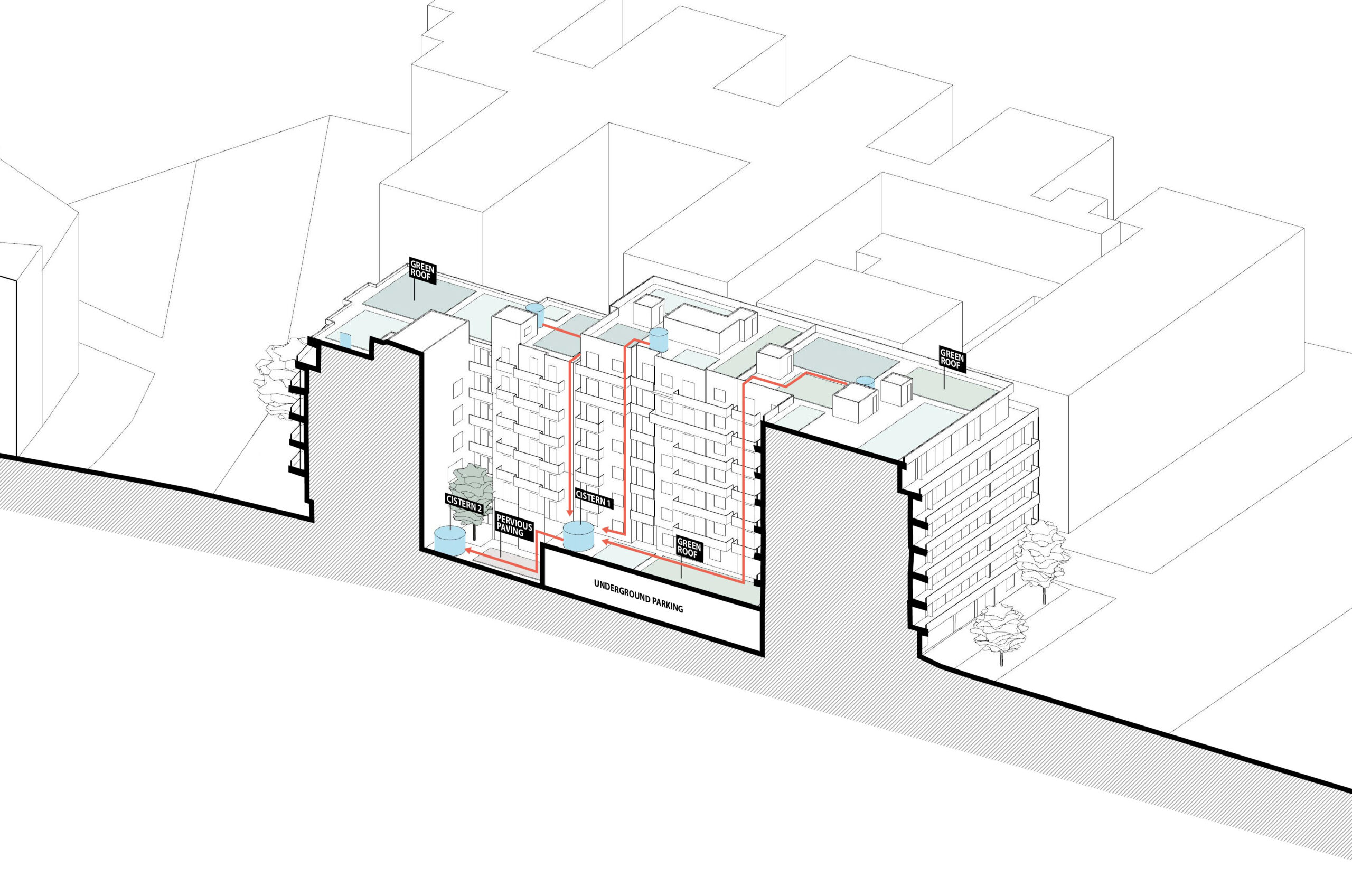 • Scenario 2 – Same BMPs plus rainwater harvesting cisterns on rooftops and in the inner blocked void.